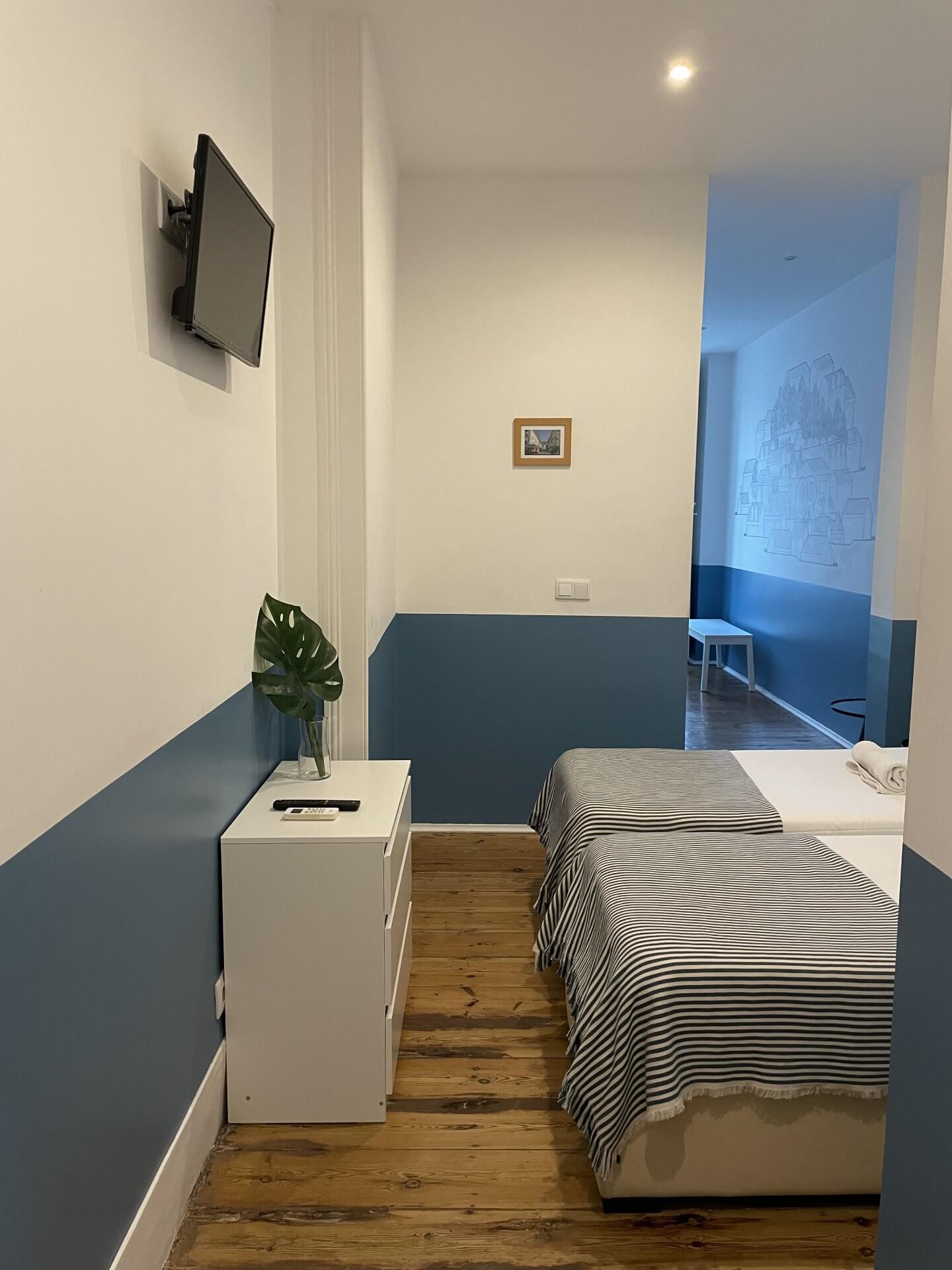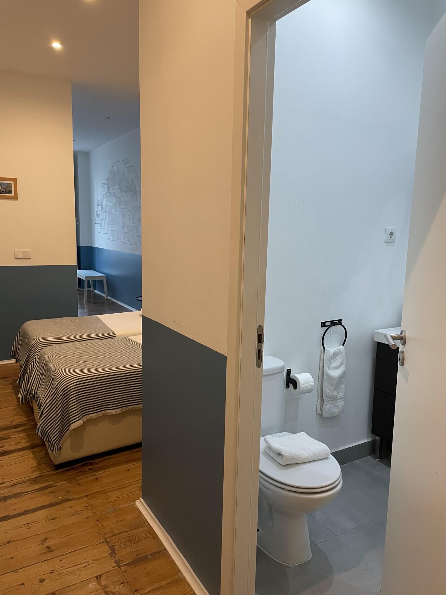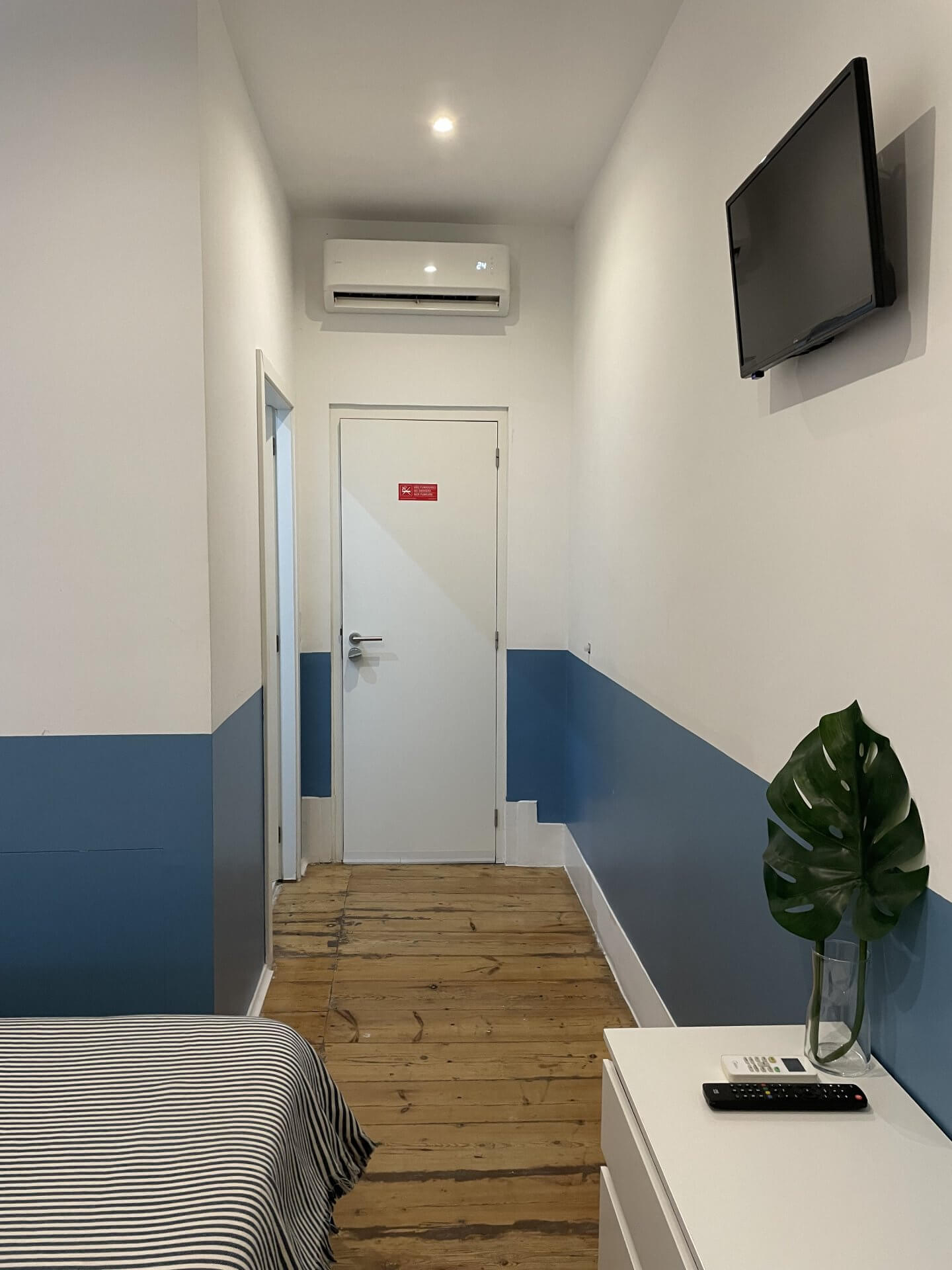 Quarto de 22m² com vista para o Largo. Dispõe de Ar Condicionado, Televisão com canais nacionais e internacionais e Wi-Fi grátis em toda a Guesthouse. A casa de banho privada está equipada com um secador de cabelo, gel de banho, shampoo e sabonete.